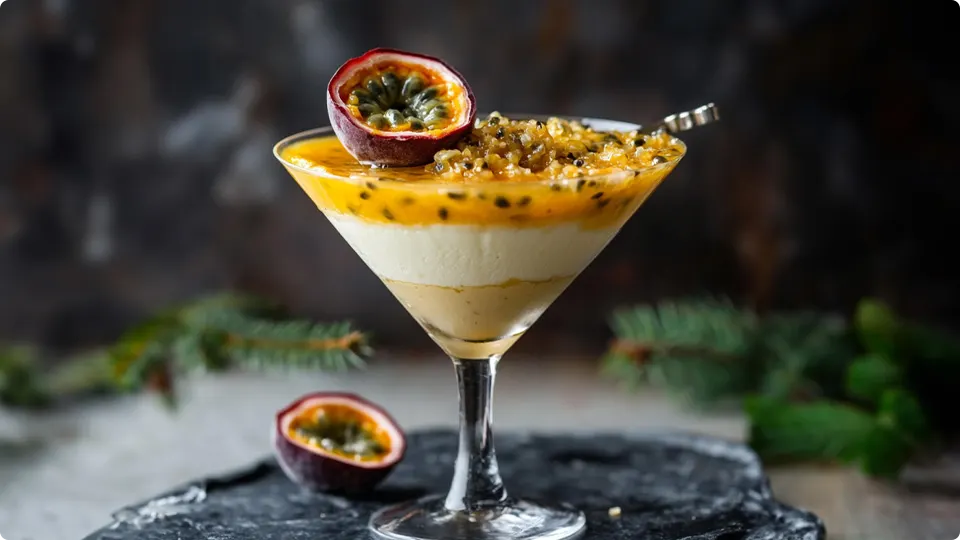 Maak laagjes in martiniglazen: eerst de koekbodem, daarna de cheesecake, en bovenop de passievruchtcurd.