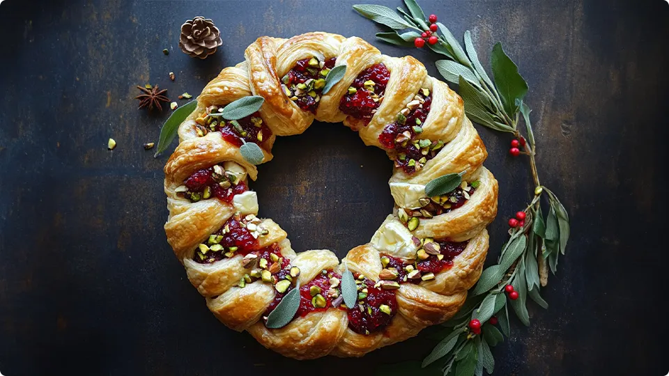 Vouw de punten van het bladerdeeg naar het midden en druk ze licht aan. Zo ontstaat een ronde krans.