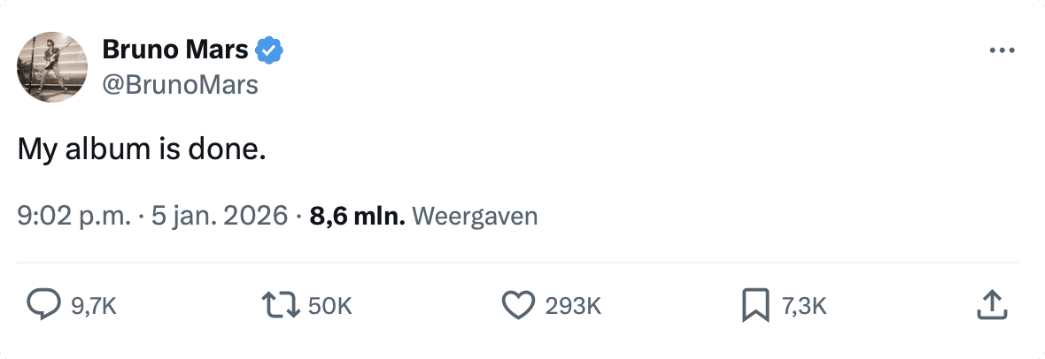 Bruno Mars heeft goed nieuws voor zijn fans: zijn nieuwe album is af. Dat maakte de zanger bekend via sociale media. “Mijn album is klaar,” schreef hij op X. Een titel of releasedatum heeft hij nog niet gedeeld.