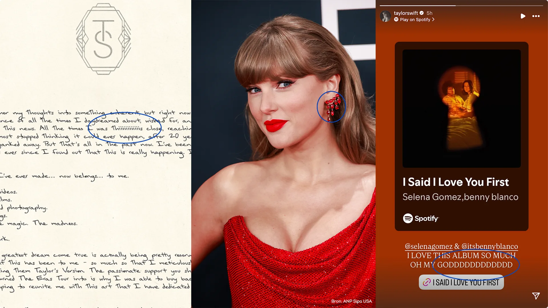Fans begonnen dan ook meteen te speuren naar meer mogelijke hints richting haar twaalfde album. Tijdens de Grammy’s in februari droeg Taylor rode oorbellen met exact 12 edelstenen. En onlangs liet ze op subtiele wijze haar steun blijken aan het album I Said I Love You First van goede vrienden Selena Gomez en Benny Blanco met opnieuw een opvallend detail. Op 22 maart schreef ze op sociale media: “I LOVE THIS ALBUM SO MUCH. OH MY GODDDDDDDDDDDD.” Juist ja: 12 keer de letter ‘D’.