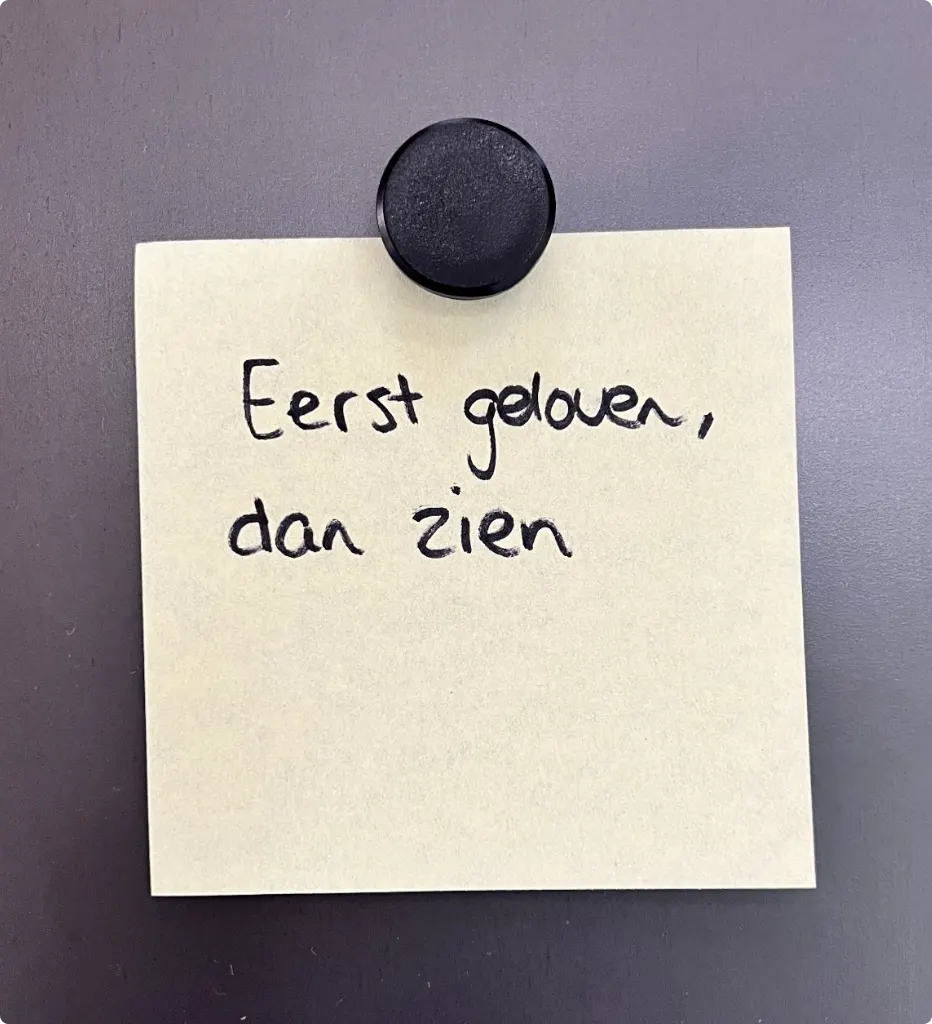 “Bij ons thuis, op de muur van onze studio, hangt een briefje. Daarop staan 4 woorden: Eerst geloven, dan zien. Eerst geloven. In elkaar. In wat we maken. In dat je altijd je eigen intuïtie mag volgen. Blijven geloven. Ook als je het alleen nog met je ogen dicht kan zien. Ook als er nog niemand anders is die hardop durft te zeggen dat het kan. Eerst geloven. Dan zien.”